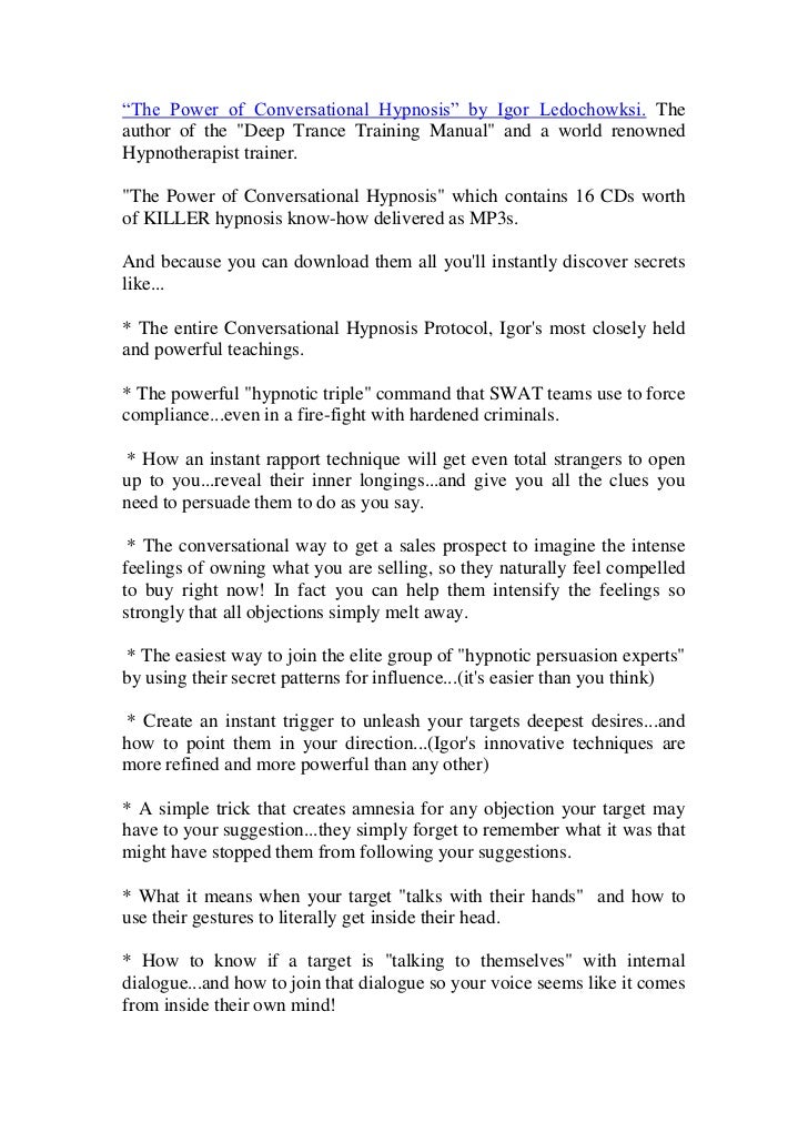 Conversational Hypnosis Covert Hypnosis Exposed. "The Power Of Conversational Hypnosis course is great. This material is easy to understand and really useful! There is so much material in the course.